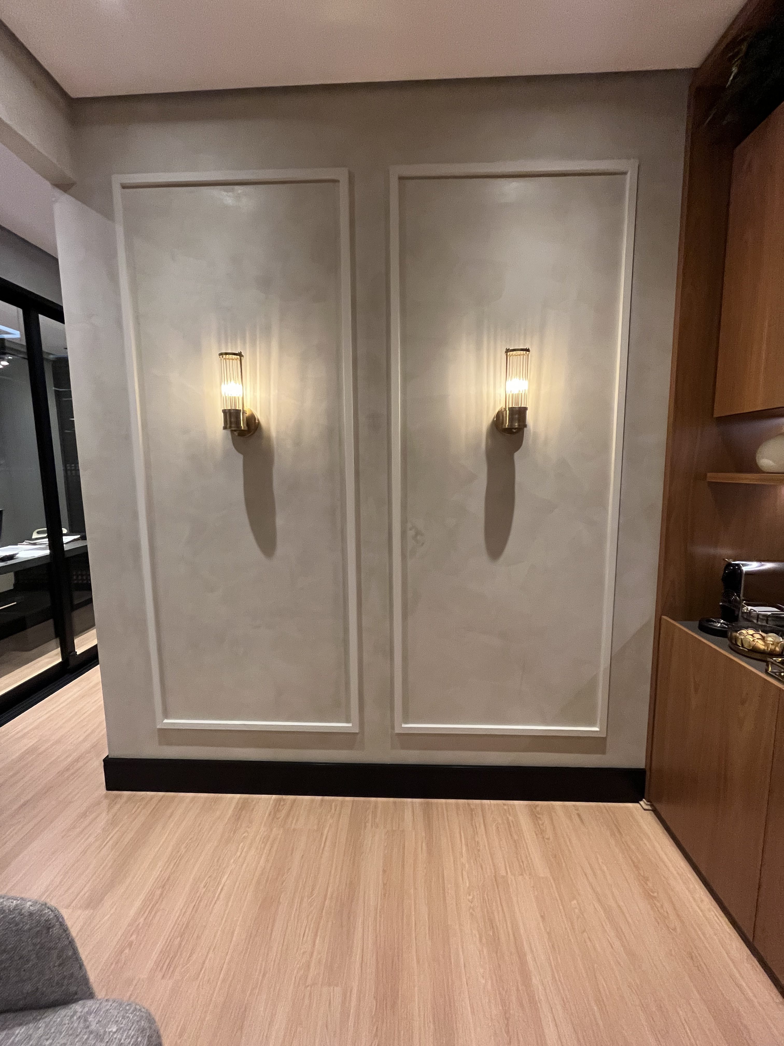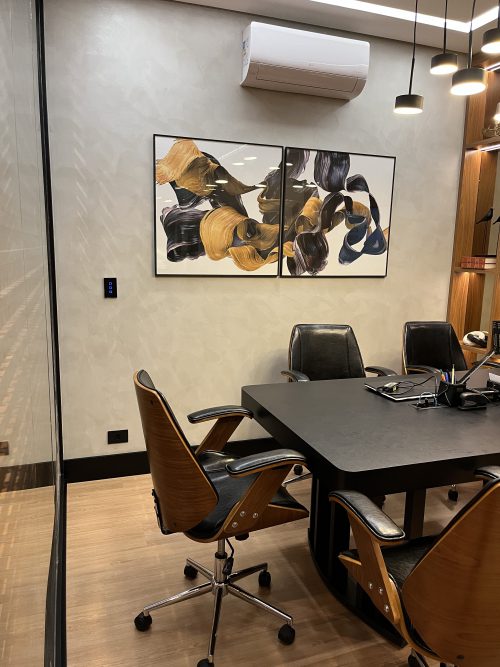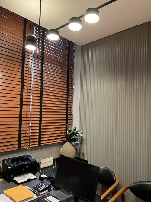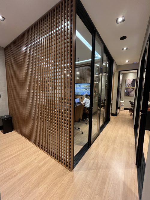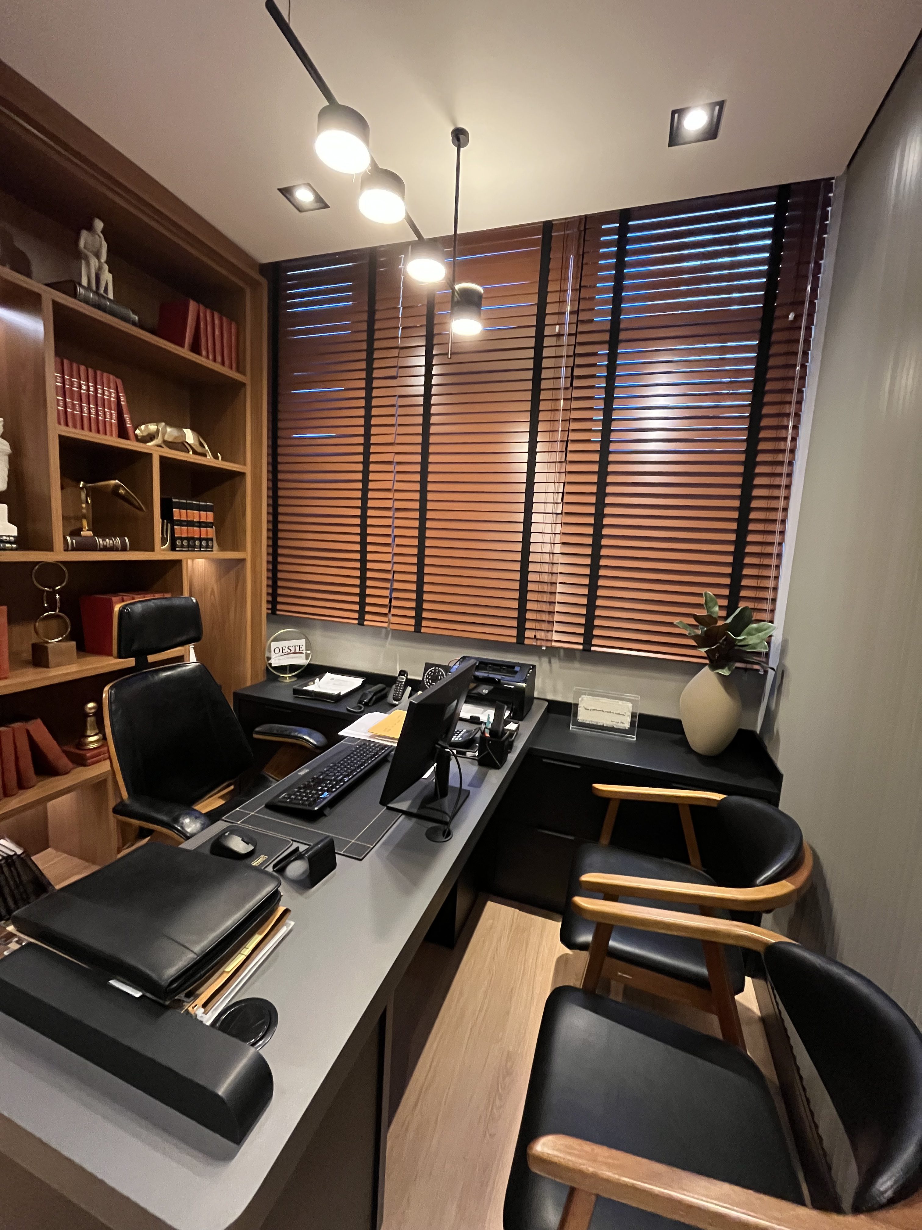 Projeto Oeste Escritório. Produtos fornecidos: Rodameio Arquitech, Rodapé Santa Luzia Preto, Piso Quick- Step Essencial Oak, Persiana Unilux Madeira Cherry e Painel Santa Luzia Gizé Cinza Glacial. Projeto de autoria de Carol Langhi. Produtos e Execução: @atelierobertocervellini